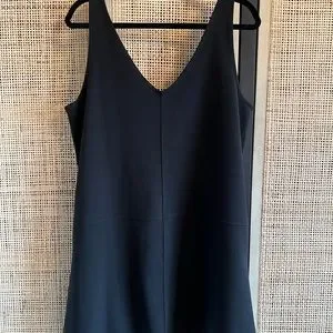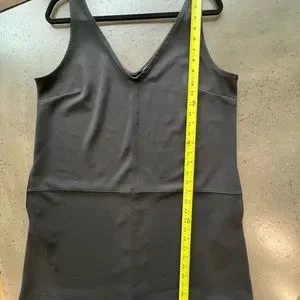Black, lined tank dress from Payton Jensen. Bra friendly! The polyester-spandex fabric combo gives this dress some stretch making it very comfortable. It has a “dressier” look. Can be worn as a tank or with a top underneath.