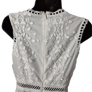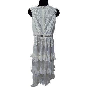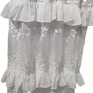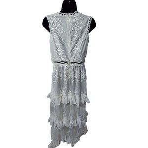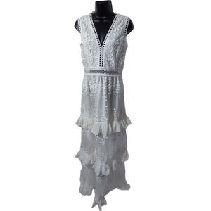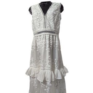 Lace embroidered maxi dress with sheer tiers and ruffles. This dress is partially lined and allows you to show off those sexy legs while being covered at the same time!