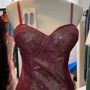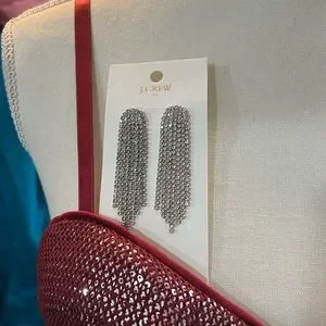 Perfect dress for prom or a night out on the town! Silver sparkly sequins on a backdrop of deep burgundy, make this body con dress stand out! Adjustable straps, hook, and eye closure and zipper in the back. Parrot with the beautiful J.Crew, sparkly fringe earrings, and your outfit is complete.