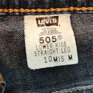 Levi's 505 medium wash, low rise, straight leg jeans, excellent cond., size 10M. 3 front pockets, 2 back pockets, zipper & button closure. 97% cotton, 3% Lycra. 28" waist (14" flat), 40.5" in length, 30" inseam.