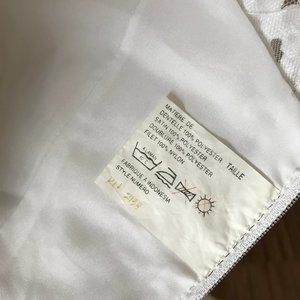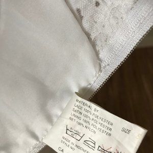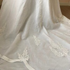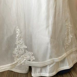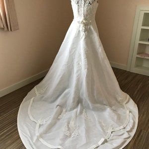 New, Bridal store sample gown, has not been worn. Wedding dress has embellished satin cap sleeve bodice and long train. Beautiful beaded & embroidered bodice, rosette detail at back waist, satin skirt with tulle overlay. Back zip closure. Train has pretty layered detail with scallop edge. Small marks/wrinkles from storage. The pictures show the actual gown that you will receive.