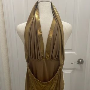 Low cut halt neck, full bottom coverage with great soft material. Show stopping.. perfect condition!