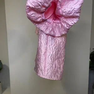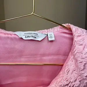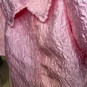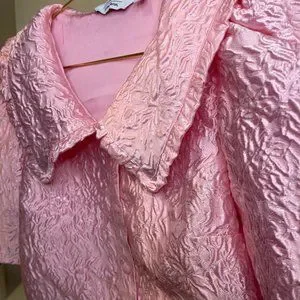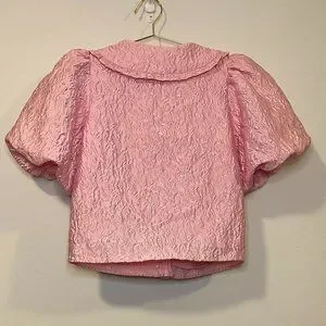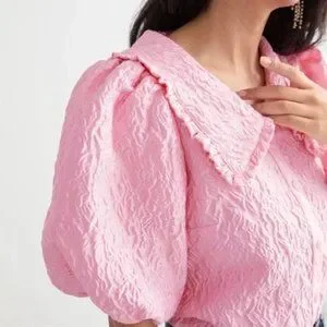 Woven buttoned top with ruffled collar, balloon sleeves and made with fun textured fabric.