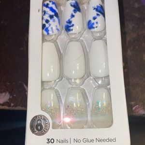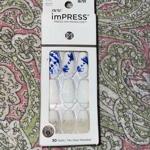 Bnib imPress press-on manicure, 30 nails in three colors. One is blue & white tye-dye, white, & silver sparkly glitter nail. Comes with 30 nails that are pre-glued, prep pad, mini file & manicure stick. These are super cute & easy to do. It’s ready to do in a box. I have other brands & colors. I’m open to offers & bundles happy poshing!!