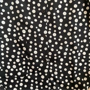 Different sizes of polka dots on shirt layer. Polka dot shirt has one pocket in the front, perfect for stashing your phone. Bottom sleeveless layer has buttons going down the front.
