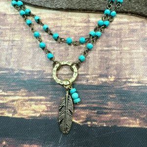 Turquoise colored bead choker necklace with Feather pendant charm