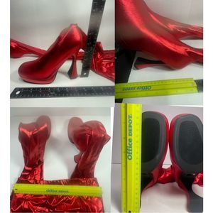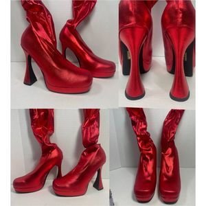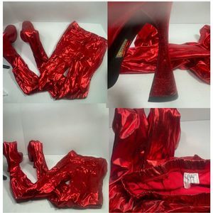 BRAND NEW JEFFREY CAMPBELL MORE BEAUTIFUL AND EYECATCHING METALLIC RED IRL. PANTALONES SIZE 6M FOR PLATFORM SHOE/BOOT AND LEGGINGS/PANTALONES ARE SIZE SMALL. Jeffrey Campbell site states PANTALONES can fit to 33” but I would firmly disagree. These measure approx 12” flat and stretch up to about 14” (for 28” total waist size.) Respectfully, I think any larger waist would stretch and potentially break the seams in waist.