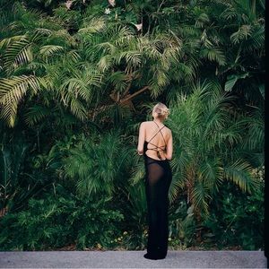 The Amanda Dress in Black by ASTA RESORT. A backless semi-sheer statement piece featuring adjustable cross-back ties and a frontal keyhole cut-out. The Amanda can be tied as a halter neck for extra support or crossed over the back for a dainty alternative. This floor-length dress is a timeless, dramatised look for day through night.