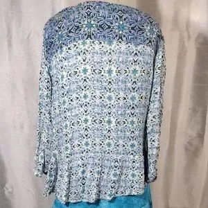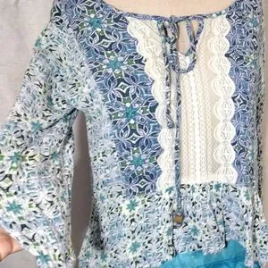 Style and Color: Crop Asymmetrical Blouse, 3/4 sleeves Lace,Tie, Paisley star pattern Blue+White