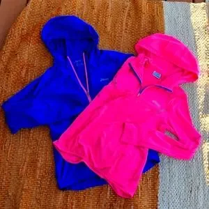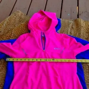 A winter runner's dream set 🥹 Women's size small EUC fleece top and polyester jacket. Hot pink and royal blue colors, top is quarter zip with awesome breathable front panel. Jacket has two outer pockets, not zippered fyi, one center back zippered pocket that is a stuff bag! Priced firm for now, thank you! Check for other awesome athletic gear and save!