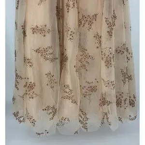 This enchanting evening gown is an elegant, fashion-forward choice for a your next formal event. A sheer illusion mesh overlays a sweetheart-cut lining, and the illusion neckline and sleeves are accented by hand-sewn bead and jewel details. The full a-line skirt features allover floral embellishments and a soft, sweeping train.