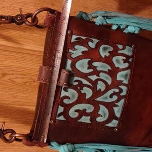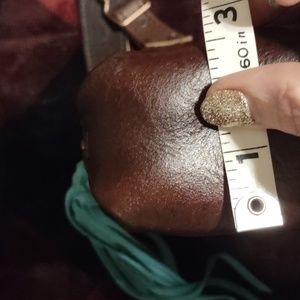 Very stiff hard leather but very durable and thick. Bought on E t.s y a woman who made her own bags. I had her add the turquoise fringe on the sides, Has more holes so you can have more or whatever you like. No pockets inside. Good Condition. Look at photos well. Non Adjustable strap I added. Nice as a crossbody. On one photo back looks like there is a couple darker spots, Bought that way. Spots were in the tanning process. Don't notice, it is in Mint he back and the bag is a chocolate brown. Nice bag.