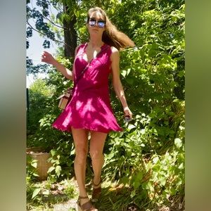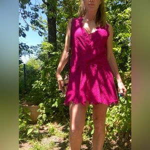Beautiful Free people fuchsia lace dress size small. The lace out layer is cut in a loose V-neck which creates a draped, flapper-style look from the 20s. The slip inside could be worn separately for a slip dress look. Two dresses for the price of one. Worn only once. Cute dress for any occasion. Can be dress up or down.
