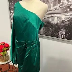 Ieena Mac Duggal Emerald Green Satin Puff Sleeve One Shoulder Gown - Reemoly