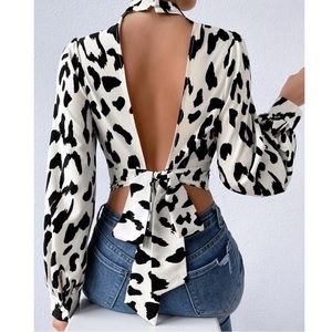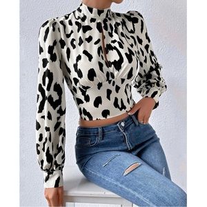 Leopard print mock neck open back crop top