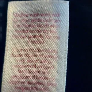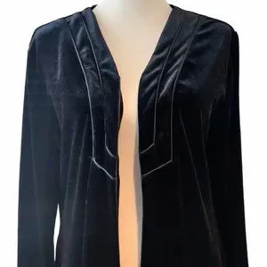 Good condition, has an area of thinning velour around the bottom of the zipper, otherwise minor signs of wear, no rips, holes or tears, material, care label is faded and hard to read, nice black velour, 1/2 zipper, side pockets