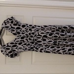 Black and white geometric pattern. V neckline front, and back, gathered waisteline, with ruffled sleeves. Stretchy.