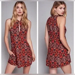 Free People Get Together Navy Orange Bohemian Print Rayon Sleeveless Mini Dress