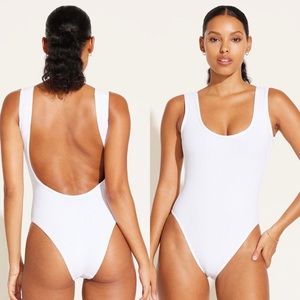 Clean, neat, and lookin' sweet AND it's reversible!!! Vitamin A brings it back to basics but throws in a sexy low cut back, scoop neck front, and their famous Cali cut coverage for just the perfect amount of cheek. This one piece swimsuit in Black EcoRib BT features wide shoulder straps for added support and comfort, contrast white piping on the solid black rib side and reverses to an all white rib. This piece is made with Vitamin A’s EcoRib BT, a lightweight, breathable, form fitting fabric with a ribbed texture made from recycled plastic bottles.