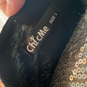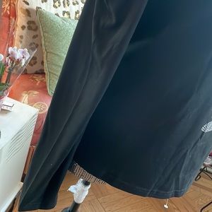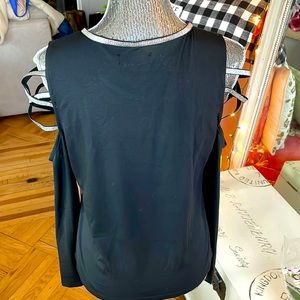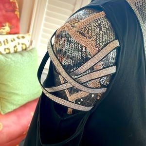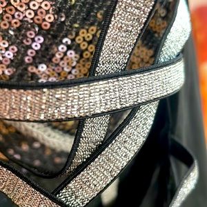 Open by shoulder area with silver ribbon like design. Silver ribbon like around neckline as well.