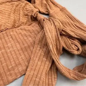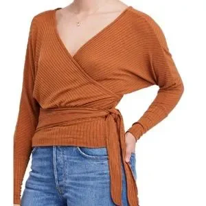 Free People OB846782 We the Free East Coast Wrap top in copper brown, women’s size small. Very soft and stretchy, knit with ribs and loose batwing sleeves. Length of top is about 22 inches.