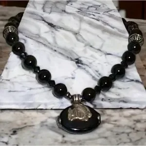 Women necklace choker length authentic sterling silver black onyx pendant beads circle clasp best accessory gem classic classy special occasion special event dinner lunch brunch fashionable casual dressy year-round all seasons spring summer fall winter confident confidence polished sophisticated showstopping showstopper standout detailed substantial heavy hefty shiny sheen glossy gleaming feminine lovely upscale elegant night out dinner party cocktail party versatile chic elevate outfit expensive jewelry style stylish vintage vogue retro quality gemstone meaning healing protection energy flow positivity spiritual fashion fun