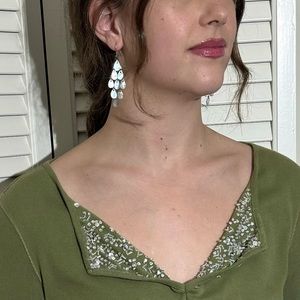 Women V neck long sleeved sleeves tee shirt T shirt casual dressy top sequins deep V pretty details gathered bodice special event occasion party fashion fashionable fashion forward fashionista unique brunch lunch dinner date stretch stretchy wear anywhere confident polished comfort comfortable effortless carefree sporty easy to wear easy to pack travel trip tour weekend versatile soft playful classic classy spring fall cute attractive concert dinner date night clubbing dangly earrings wires white sequins chic fun