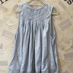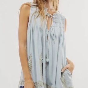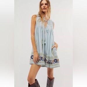 Free People Love All Mini Dress Floral Embroidery Silver Pleated Wash Blue