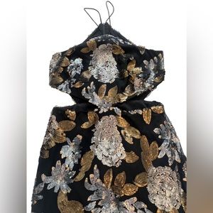 Spectacular cutout gown with bronze and silver sequin detail. Perfect for prom, wedding guest or any other special occasion.