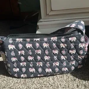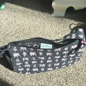 Approx 10 inches across and 6 inches tall this Vera Bradley purse features adorable pink elephants. Zipper closure with two side pockets.