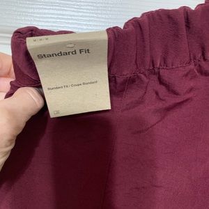 Made with recycled materials, has zippers in the front of both legs, 4 pockets in the front, none in the back. Length from waist to hem is 41 in. size Medium. There is elastic on the back of the waistline. Maroon color-not as light as the pictures show. The material is soft & this is a hard to find item.
