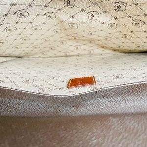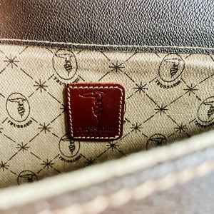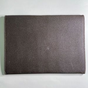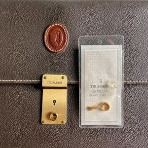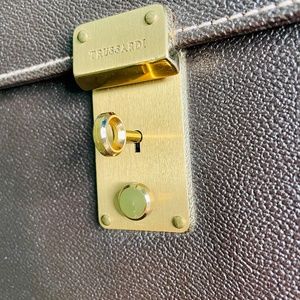 Trussardi Dark Brown Document Holder Case or Portfolio Bag with Lock & Key. Exterior is pebble textured coated canvas with Trussardi greyhound logo leather patch and gold tone metal hardware. Clasp closure has a built-in locking mechanism and comes with a key. Interior is lined in fabric with the Trussardi monogram. Approximate measurements are 15 inches x 11 inches. Authentic and Made in Italy. Pre-owned vintage piece with some wear - including small stitch damage on one side of the top-interior opening and white paint splatter/markings on the back of the bag (last 2 photos). Note: clasp closure works fine for opening and closing the bag. I did not use the lock & key as I found it hit or miss. Overall great looking old vintage Italian bag.