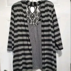 Deb Black & Gray Striped Cardigan with Lace Trim size 2XL
