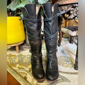 Meet CASSIUS. Its unique back-lacing ankle overlay is complemented by stunning leather straps and silver buckles that wrap its tall shaft. A full inside brass zip closure allows for effortless wear.