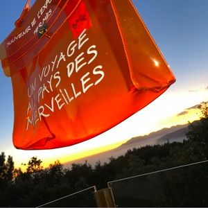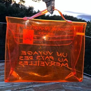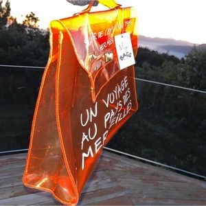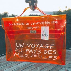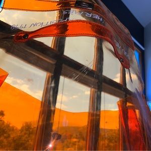 in the instantly recognizable signature Hermes Orange color ๐งก crafted of transparent vinyl and features writing in contrasting whit