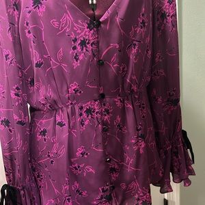 Full front button close, Neck tie detail, Allover floral print. Size L