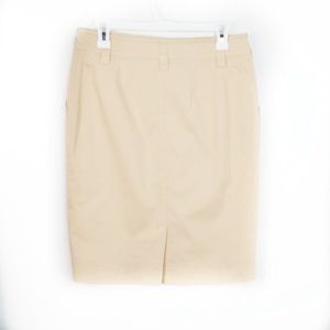 ST. JOHN ▪︎ Safari Style Khaki Skirt In excellent condition, like new, no holes or stains, Cotton/spandex with silk edging, 3 belt loops, slit in back, button hook, zipper fly, knee length, Classic And Trendy, comfortable and stylish, featuring flapped big patch pockets w/ 1 button, hook, button and zipper fly, 2" waistband, 3 belt loops in back and a 6" slit in back. Knee lenth and in excellent condition w/o stains, snags or pulls. Trendy and classic, cotton/spandex w/ silk edging. no trades