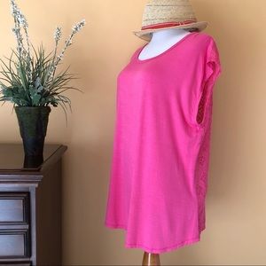 EXTRA TOUCH~PINK~Soft fabric~Slightly scooped neckline~Sleeveless~Crocheted lace back with keyhole opening (semi sheer)~Slightly rounded hemline~2X