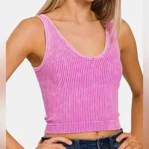 Zenana Neon Moon Hot Pink Acid Wash Ribbed Knit Round Neck Cropped Tank Crop Top