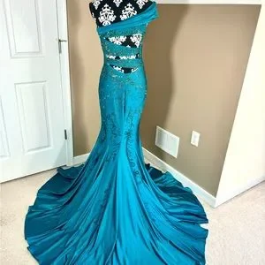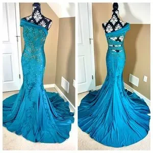 This is one of my favorite gowns ever! It’s a teal with ombré beading one-shoulder gown with elegant cutouts in the back. Crafted from 4 Way Stretch Lycra, this fit and flare gown is a vision of elegance. Perfect for prom, formal or pageant. I’m 5’10 without heals in the photo and the dress is too long, I could easily wear 5 inch heels. No damage to the dress. The train is absolutely beautiful! I normally go for Sherri Hill or Jovani gowns but this one I love even more!
