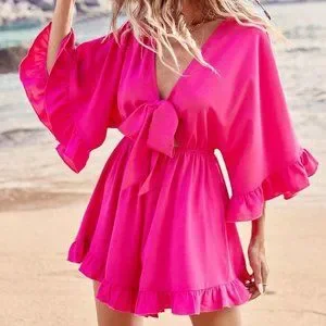 Hot Pink Boho Women Outfits Vacation Front Knot Valentines Pink Romper Shorts