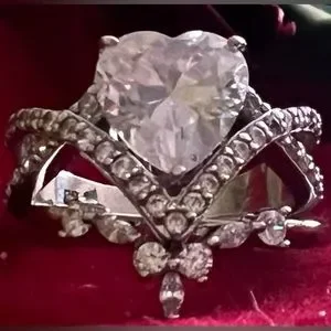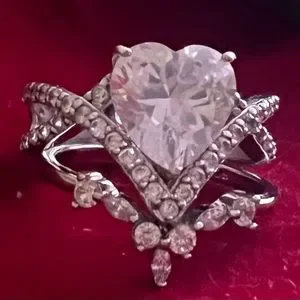 Gorgeous 'Bangkok Ratnaraj Jewelers' Heart Shaped Imitation Diamond Set in a Very Unique Sterling Silver (Hallmarked .925 and BBJ) Setting with Round Cut Accent Diamond’s (CZ) Forming a 'V' Shaped Halo Under the Mainstone.