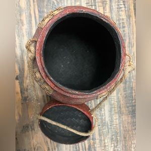 Used - Vintage Upcycled and hand painted rice container with lid and burlap string strap for easy transporting . Little wear , pictured corner - in great used condition . Stands 12” tall - 14” with lid on - x 7” round x 6” base .