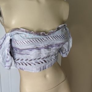 This is a cropped, off-the-shoulder blouse with a sweetheart neckline, smocked back and puff sleeves. It's made from 100% organic linen. This version comes in a hand-drawn print that’s exclusive to the brand.