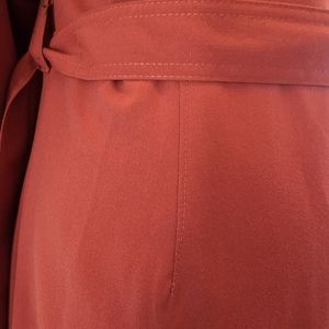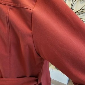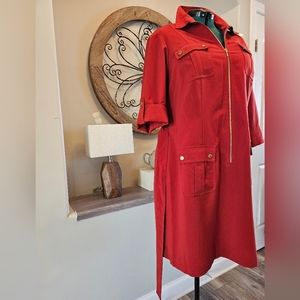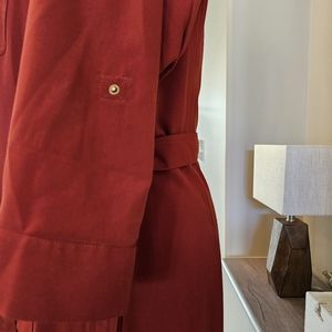 This beautiful knee-length Sharagano New York shirt dress is perfect for any occasion. With a solid rust color, collared zip neckline, and brass snap button detail on all pockets with front 1/2 zip closure, it's both stylish and comfortable. The cotton fabric and long to mid length sleeves make it ideal for summer, fall, and spring.