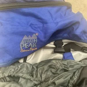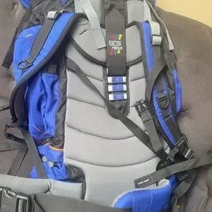 Traveling backpacking backpacker luggage blue black gray camping hiking