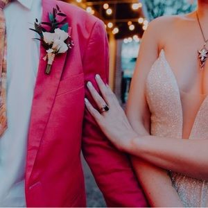 I had this dress made custom for me for my wedding. It’s a full length a-line gown made entirely with glitter tulle. The deep plunging neckline shows off the collar bone and makes the neck look long and graceful.
