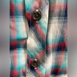 NWT - Red, white, and turquoise blue plaid, 100% cotton, excellent condition, never worn. Very lightweight. Vintage from circa 1999-y2k.