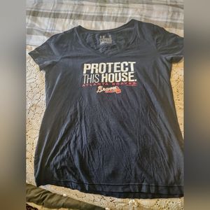 Atlanta Braves T Shirt could be for a man or a woman this is Under Armour in a size X Large in blue and red in good condition. Perfect for the Atlanta Braves fan 🤩😍🤩❤️🤩❤️😍