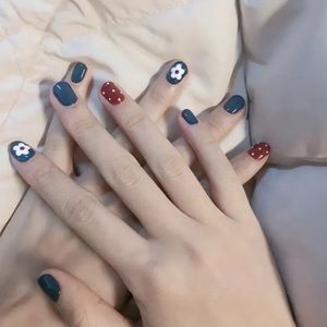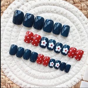 This item is a pack of 24 press on nails. These nails are red white blue and do have a floral and polka dot design. They are BRAND NEW!